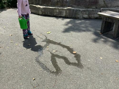 In der Klasse 1b wurden „Bilder“ mit der Gießkanne erzeugt – was gar nicht so einfach war!